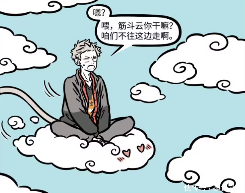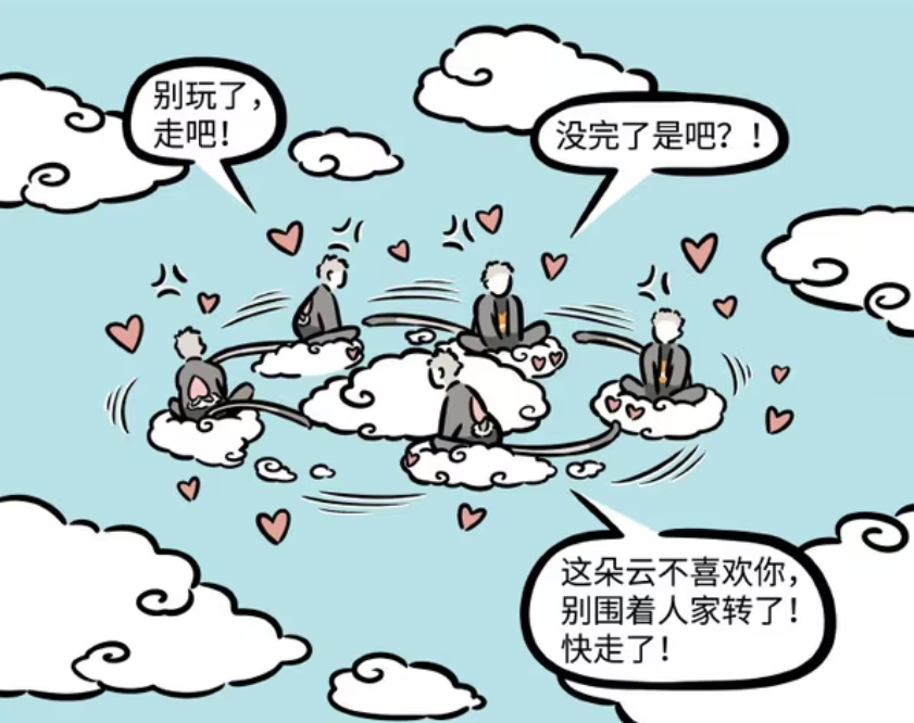 其实筋斗云也想谈恋爱,看中了天空中的某一团云。可是不是所有云都带有自我意识,这一团云明显就是无意识的云朵。可是筋斗云没有放弃,非要表白。孙悟空让它别玩,可是筋斗云听不进去。不管怎么绕着这一朵云,筋斗云都没有如偿所愿。