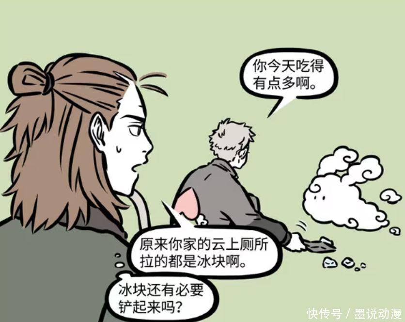 杨戬和孙悟空是好朋友,平时也会聚在一起。这一次杨戬和孙悟空出来散步,筋斗云似乎吃多了想要拉肚子。看过之前漫画的都知道,筋斗云平时排出来的东西就是冰块,敖烈可以说是很了解,毕竟他“处理”过。